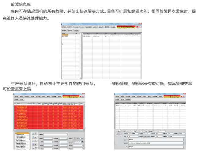 AGF系列起重機械安全監(jiān)控管理系統(tǒng)是我公司自主開發(fā)研制的產(chǎn)品,按照國質(zhì)檢特聯(lián)【2011】137號文件的要求,嚴(yán)格執(zhí)行國標(biāo):GB/T 28264-2017生產(chǎn),廣泛用于各行業(yè)大型起重設(shè)備機械、提升機、架橋機、港機、工程機械等,系統(tǒng)是為各種起重機的運行監(jiān)視、診斷分析、設(shè)備預(yù)警與檢修維護(hù)而搭建的信息系統(tǒng)管理平臺。系統(tǒng)實時記錄起重機的運行參數(shù)、操作記錄,當(dāng)滿足故障條件和設(shè)置預(yù)警值時,系統(tǒng)及時提醒和記錄各種事件信息,為起重機的操作人員和維護(hù)人員提供實時的、詳盡的歷史數(shù)據(jù)和分析報表。起重機安全監(jiān)控管理系統(tǒng)具有可靠穩(wěn)定性、靈活交互性、便捷易用性,是集實時監(jiān)控﹑故障報警﹑數(shù)據(jù)登錄﹑設(shè)備維護(hù)﹑運行統(tǒng)計于一體的現(xiàn)代起重機綜合信息管理平臺。