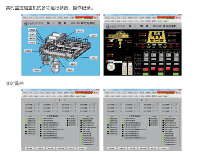 •-1、起重機狀態(tài)實時監(jiān)測:對事故易發(fā)設(shè)備和重點關(guān)鍵設(shè)備的運行情況進(jìn)行實時監(jiān)測,同時 對采集的數(shù)據(jù)進(jìn)行分析整理,并把現(xiàn)場的實際數(shù)據(jù)與相關(guān)的設(shè)備運行指標(biāo)進(jìn)行對比,超過偏 差限制時產(chǎn)生報警信息并存儲報警記錄。共享相關(guān)數(shù)據(jù),為及時發(fā)現(xiàn)和消除設(shè)備故障隱患提 供必要的數(shù)據(jù)支持。
