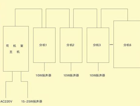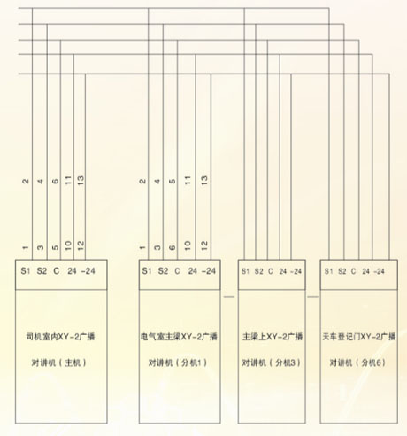 XY―2型系列產(chǎn)品廣泛應(yīng)用于冶金、電力等行業(yè)的有線對(duì)講系統(tǒng),在天車上其主站安裝在司機(jī)室,分站可以分布在電力室內(nèi)、高壓室、大小車上和天車登機(jī)門。該系統(tǒng)由若干臺(tái)廣播對(duì)講機(jī)組成一個(gè)機(jī)內(nèi)通訊網(wǎng)絡(luò),各個(gè)有線廣播站內(nèi)置揚(yáng)聲器和送受話器,任何一個(gè)廣播站喊話,其余話站均能接通廣播?梢允股a(chǎn)人員方便地與天車操作人員取得聯(lián)系。在各個(gè)站操作時(shí)無(wú)需撥號(hào),可以方便的實(shí)現(xiàn)一對(duì)一講話,各話站并列接線,用戶可根據(jù)工藝要求任意擴(kuò)充,每個(gè)話站都是一個(gè)獨(dú)特的系統(tǒng),任一臺(tái)損壞,不會(huì)影響其余分站正常工作。在起重設(shè)備上可以方便地實(shí)現(xiàn)上下車聯(lián)系,機(jī)內(nèi)操作人員相互通訊。接線原理框圖參見附錄。