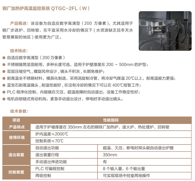 爐窯高溫監(jiān)測監(jiān)控系統(tǒng)是專為工業(yè)高溫爐窯監(jiān)測監(jiān)控的設計的智慧管理平臺,是針對爐壁開孔和爐窯視像有嚴格要求的高溫爐窯而研制的高溫工業(yè)電視。利用特種高溫孔式光學鏡頭,鏡頭設計采用中繼物鏡,兩次成像系統(tǒng),使像面在遠離觀察孔的CCD靶面上形成,最大限度的減少進入攝像機的熱輻射,致力為冶金、電力、建材、礦山、化工等行業(yè)服務。我公司研發(fā)主導產品已擁有第三代SG內窺式高溫工業(yè)電視系列、爐壁式高溫工業(yè)電視系列、內窺式拐角高溫工業(yè)電視系列、鍋爐汽包水位電視系統(tǒng)等成套設備,以及各種風冷防護罩,水冷防護罩,渦旋制冷防護罩等工業(yè)監(jiān)控設備配套產品。產品廣泛應用于鋼鐵廠加熱爐、退火爐,電廠鍋爐爐膛火焰、水泥廠回轉窯窯頭看火、篦冷機看料、玻璃廠玻璃熔窯等特殊高溫環(huán)境。幫助用戶進行工業(yè)爐實時電視監(jiān)測及控制,解決設備的運行故障等,對用戶改善產品質量、降低成本、安全生產有著獨特的成效。受到了用戶的一致好評。